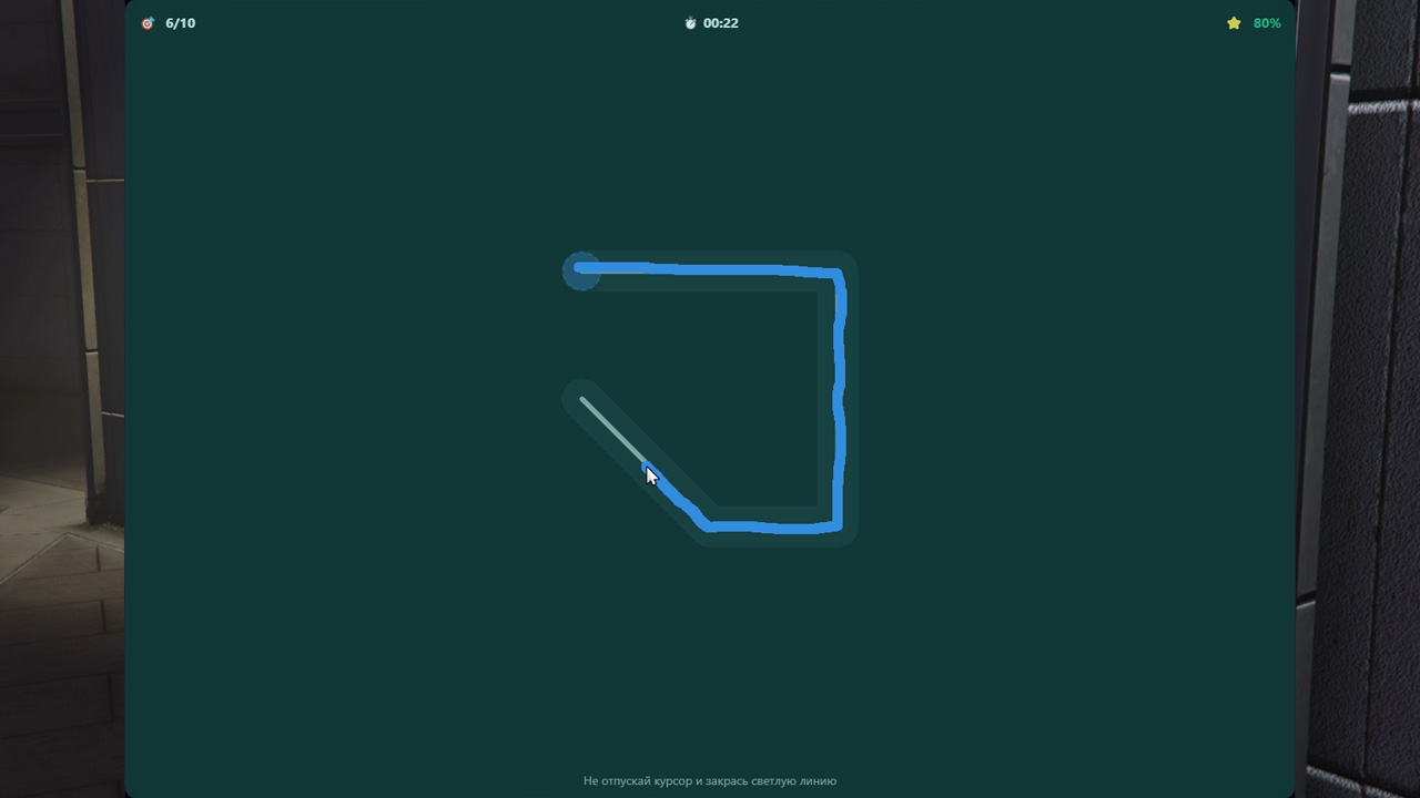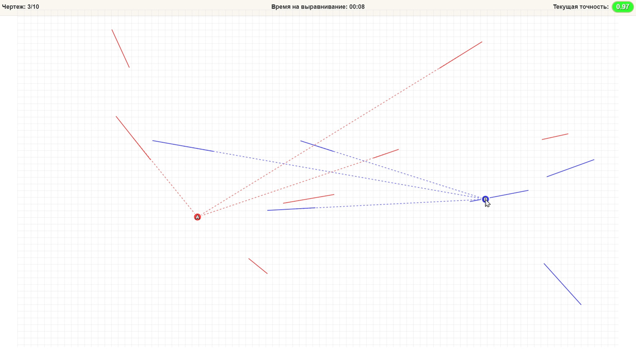 Во втором задании надо выровнять перспективу для точек A и B так, чтобы ключевые линии сходились и индикатор точности рос. Точки перетаскиваются по полю зажатием левой клавиши мыши. Во время выравнивания стоит опираться на суммарный показатель 0.9 и выше.