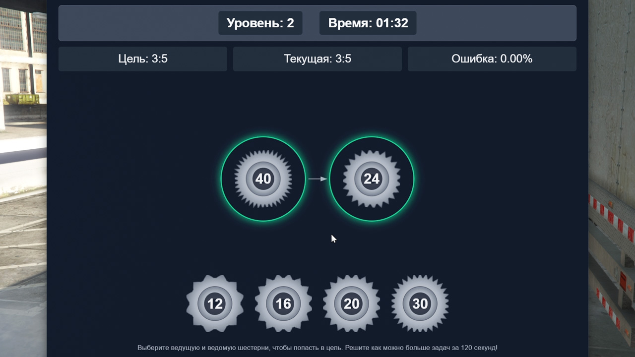 На экзамене надо подбирать передаточное отношение шестерней. На выбор будут 6 вариантов: 12, 16, 20, 24, 30 и 40. В поле «цель» будет указано передаточное отношение, по нему надо подобрать ведущую и ведомую шестерни.