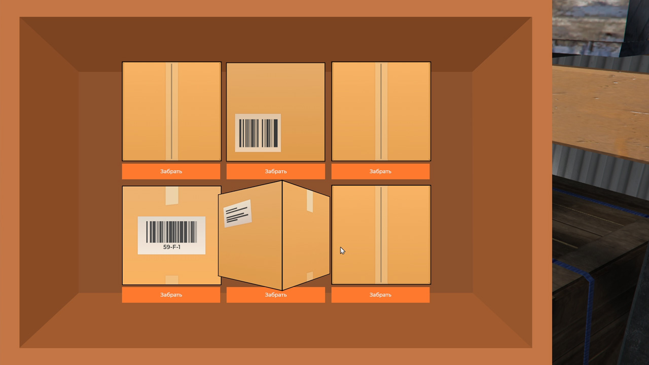 На экзамене надо отыскать на складе посылки по предоставленным трек-кодам и передать их заказчикам. На складе находятся 6 рядов палет (нижние и верхние). Каждый ряд пронумерован от 1 до 7 и содержит только определённый формат трек-кодов. В трек-коде, предоставленном заказчиком, зашифрован номер палета (например, код 98-В-5 означает, что нужная коробка находится в 5-ом палете). Усложняется поиск тем, что посылки в палете могут быть перевёрнуты, и чтобы увидеть лейбл, необходимо их покрутить.